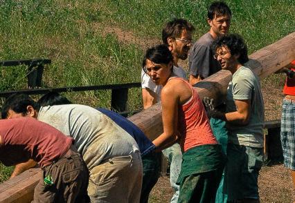 un gruppo di persone lavora alla costruzione di un piccolo Totem da lasciare a Granara. Il laboratorio viene diretto da Maria
